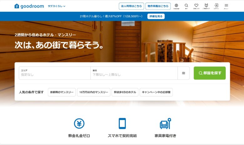 | 滞在可能エリア | 全国+海外(約2,000拠点) | 全国(地方・離島含む) | 都市部中心(東京・大阪など) | 全国主要都市(goodroom提携物件) |