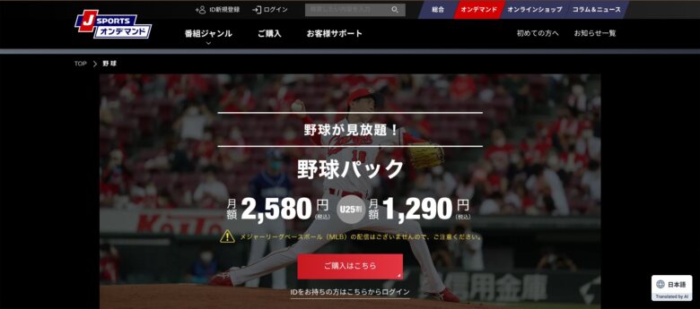 | 7位 | J SPORTSオンデマンド(野球パック) | 2,580円 (U25割 1,290円) | なし | 中日・広島 など J SPORTS契約球団 | あり | HD〜フルHD スマホ/PC/TV | 月単位で解約可能 | セ・リーグ主催試合対応 |