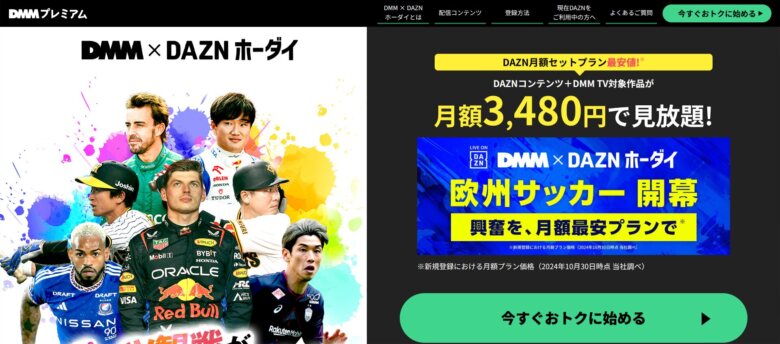 | 2位 | DMM × DAZNホーダイ | 3,480円 | DMMプレミアム特典あり | 広島以外 11球団 | あり | フルHDの 高画質 (4K配信なし) スマホ/タブレット/PC/TV対応 | 月単位で解約可能 | DAZNStandard4,200円/月+DMM550円/月の お得セット 年間10,000試合以上をライブ中継 アニメや映画、ドラマも見れる |