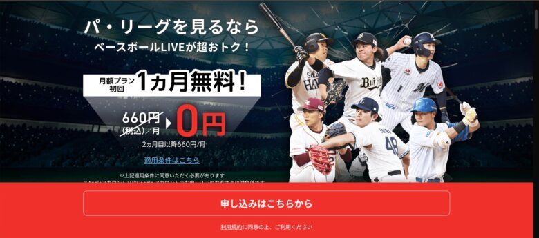 | ベースボールLIVE | 660円 | 初回1か月無料 | パ・リーグ 主催試合 | あり | HD〜フルHD スマホ/タブレット/PC | 月単位で 解約可能 | コスパ最強! ソフトバンクユーザーは月額料金20% PayPayポイントが溜まる |