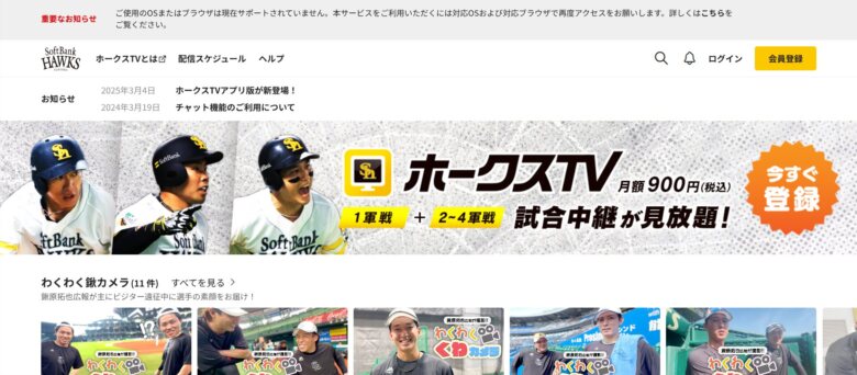 福岡ソフトバンクホークス主催試合を生放送で視聴できるほか、Vリーグや高校野球九州大会も配信しています。