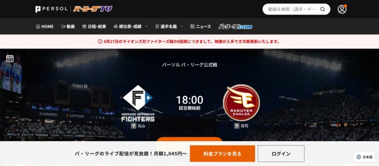 | 4位 | パ・リーグTV | 一般 1,595円 ファンクラブ会員 1,045円 | なし | パ・リーグ全試合 | あり | HD〜フルHDの 高画質 スマホ/PC/タブレット対応 | 月単位で解約可(1日単位チケットあり) | ファーム戦も配信、選手密着番組あり 660円で1日限定視聴チケット購入できる |