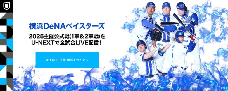 | 12 位 | U-NEXT | 2,189円 | 31日間無料 トライアルあり | 横浜DeNAベイスターズ主催試合 | あり | 高画質(フルHD/4K作品もあり) スマホ/PC/TV/タブレット | 月単位で解約可 | 横浜DeNAベイスターズの ドキュメンタリー配信あり ゴルフも楽しめる |