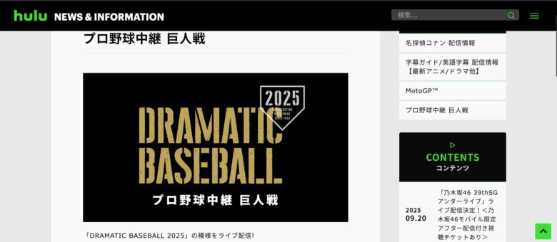 | 13 位 | Hulu | 1,026円 | 14日間 無料トライアル あり | 巨人戦のみ | なし | フルHD スマホ/PC/TV/タブレット | 月単位で解約可 | 巨人戦はライブ中継のみ 海外ドラマ等も豊富 |