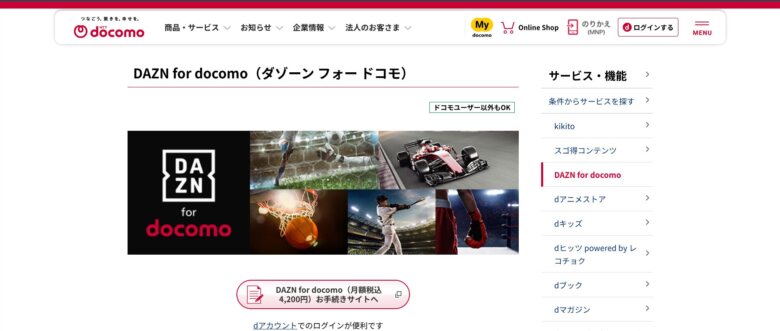 | 17 位 | DAZN for docomo | 4,200円 | なし | 広島以外11球団 | あり | フルHD(4K配信なし) スマホ/タブレット/PC/TV | 月単位で解約可 | docomoユーザー向け割安プラン オリジナルコンテンツあり |