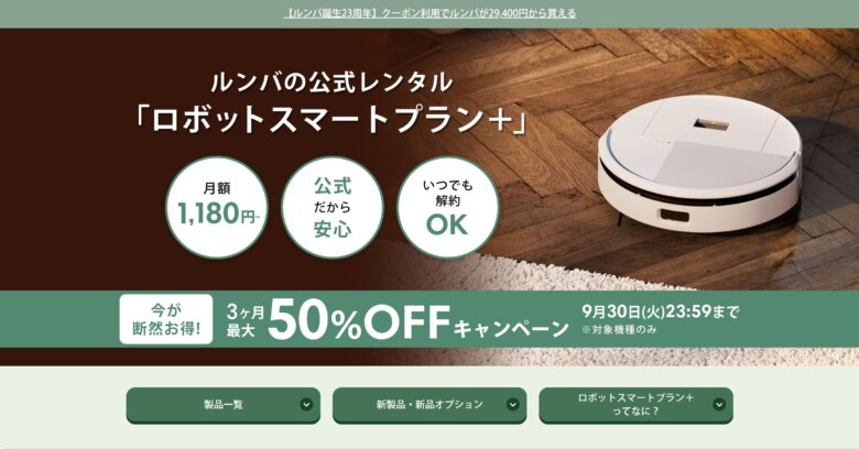 | 6 | iRobot | 1,180円~(ひと月) | 合計3,980円(税込)以上のご購入で送料無料 | 〇 | 全国(沖縄を除く) | 無償で修理対応を行うメーカー公式保証が付き | 請求あり |