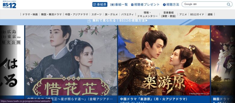 中国ドラマを視聴できるおすすめサブスクランキング第8位は「BS12トゥエルビ」。