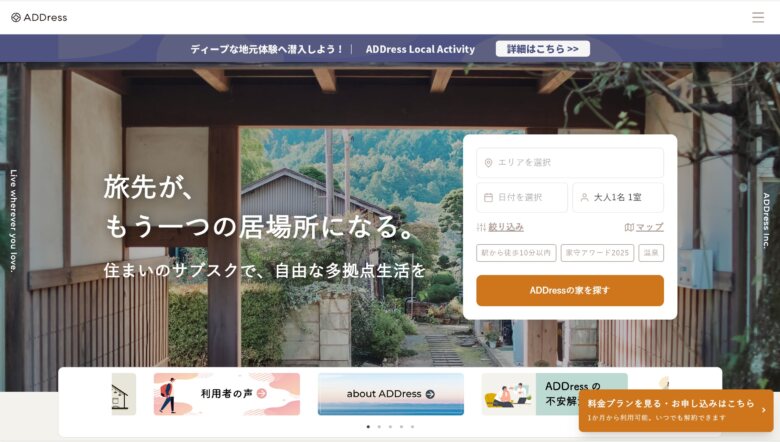 ADDressは、国内・海外の約300か所の家に泊まれるサブスクサービスです。