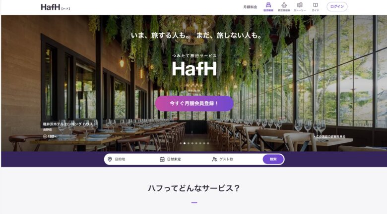 | HafH | 3,400円〜(コイン積立制) | 0円 | 国内外ホテル | ホテル型サブスク・海外対応 | 旅行好き・出張多い人 |